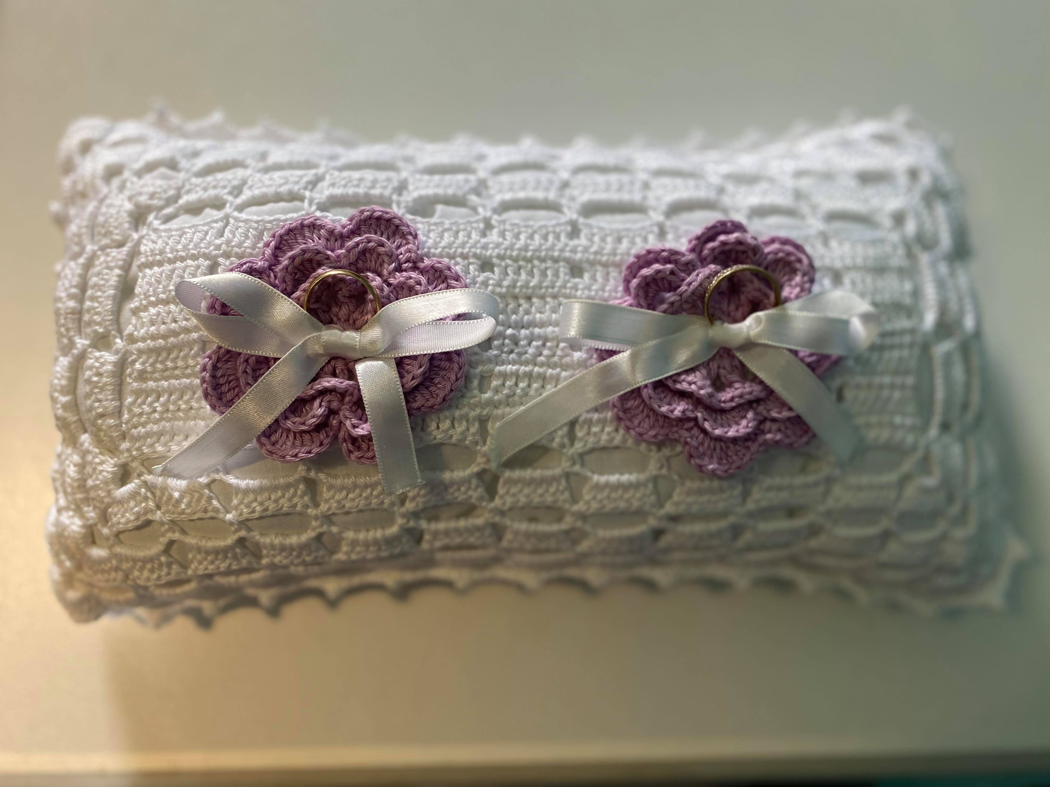 Ce coussin blanc réalisé au crochet par mes soins, fera sensation lors de votre cérémonie de mariage