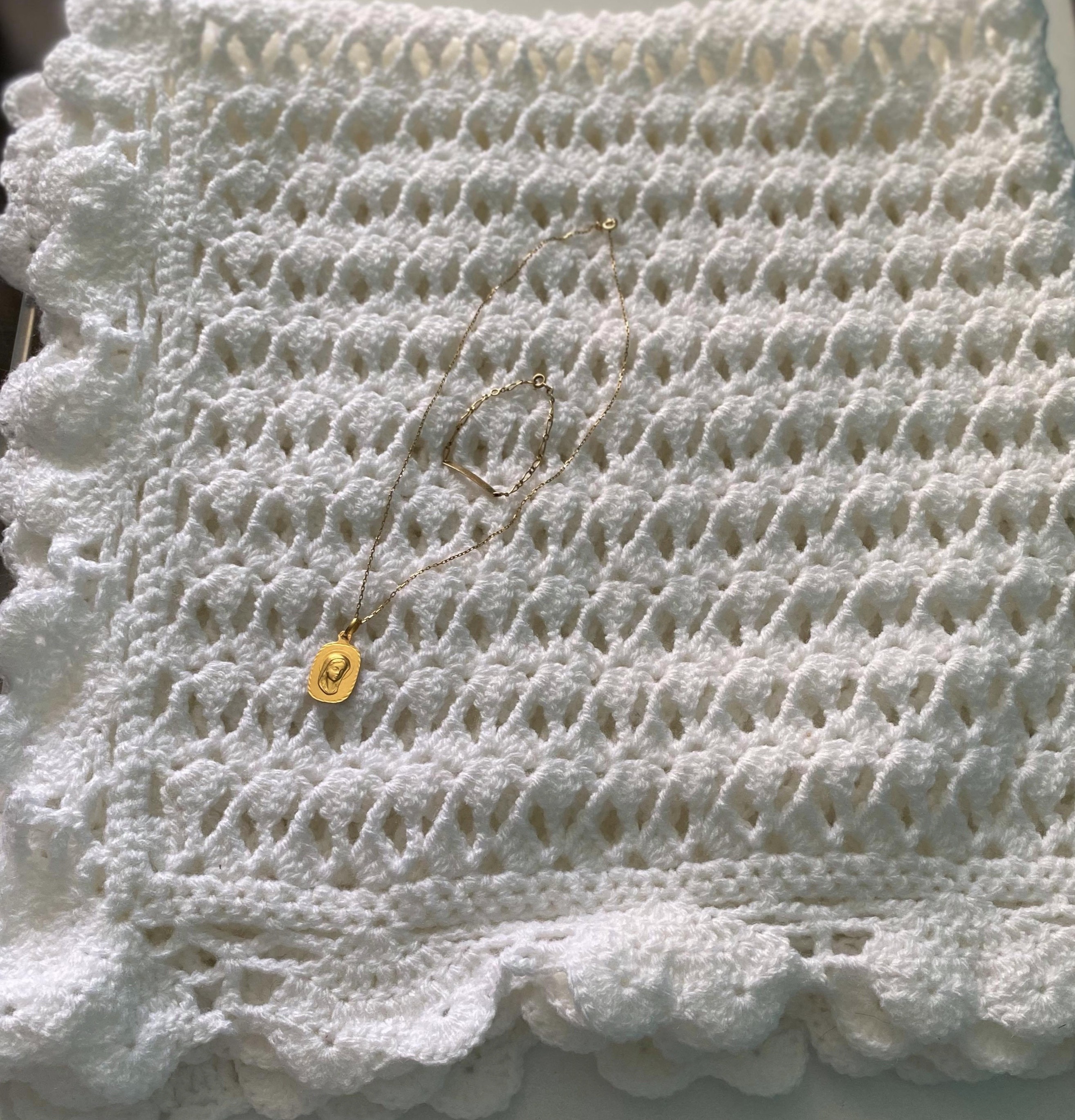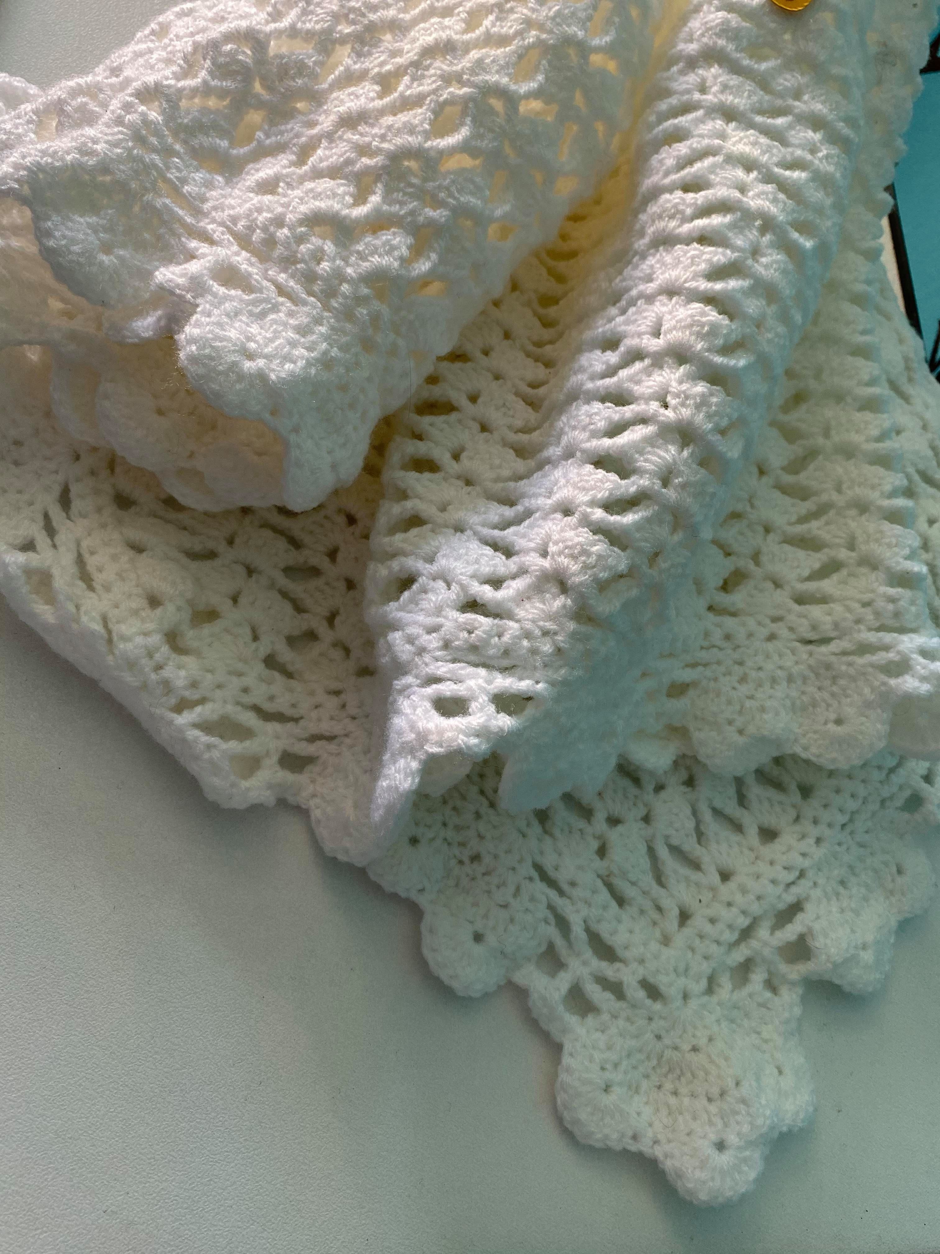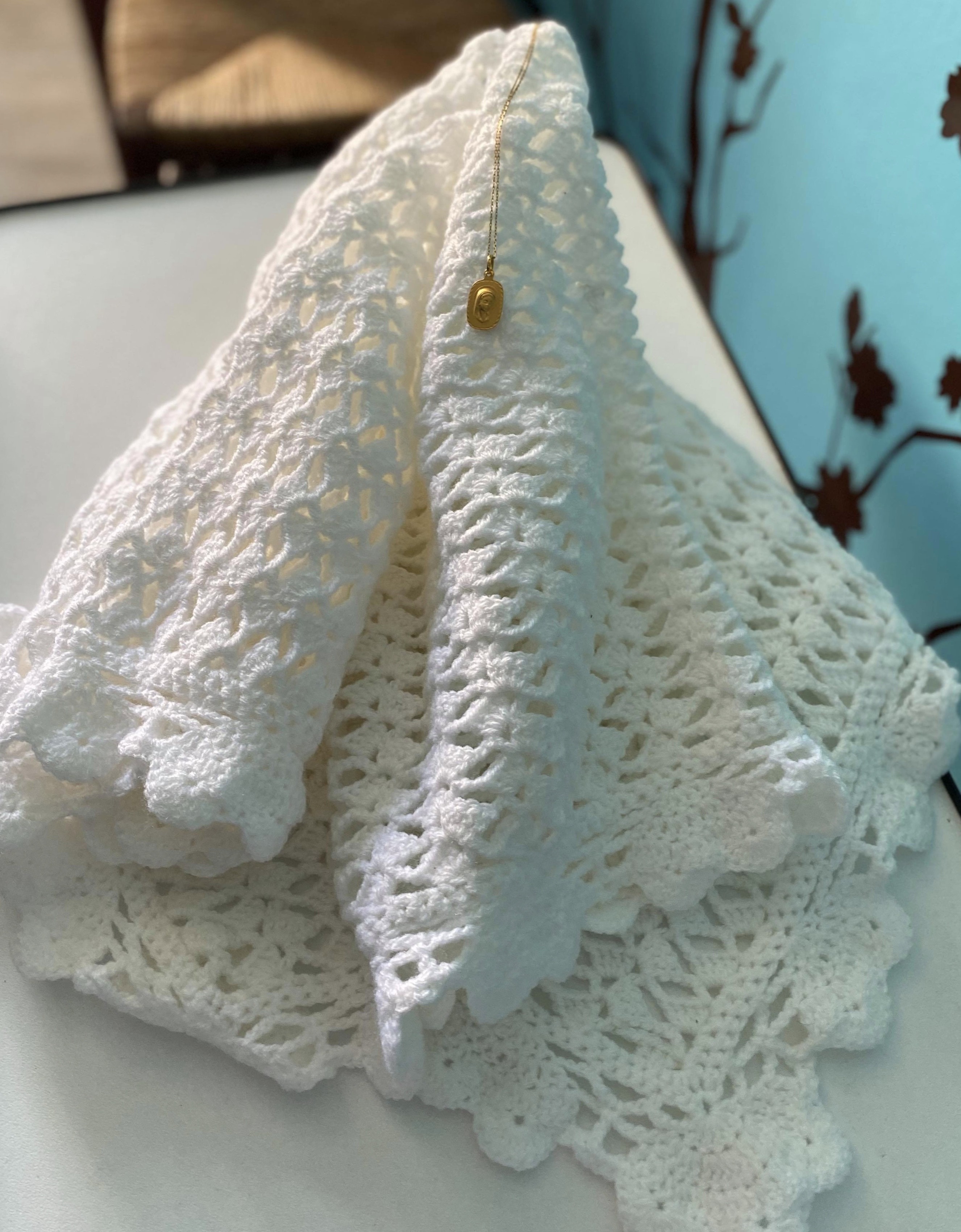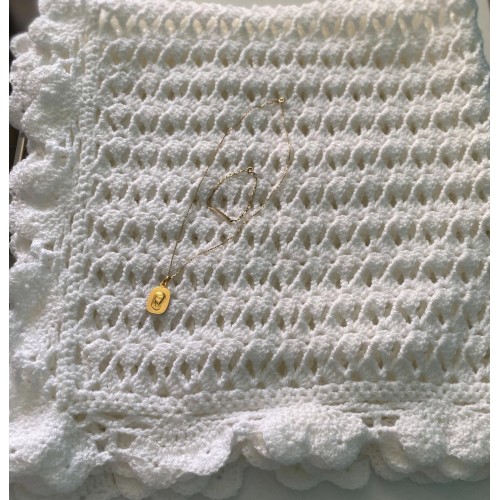 Ce carré blanc réalisé au crochet par mes soins, remplira avec élégance cette fonction et tiendra votre bébé bien au chaud.