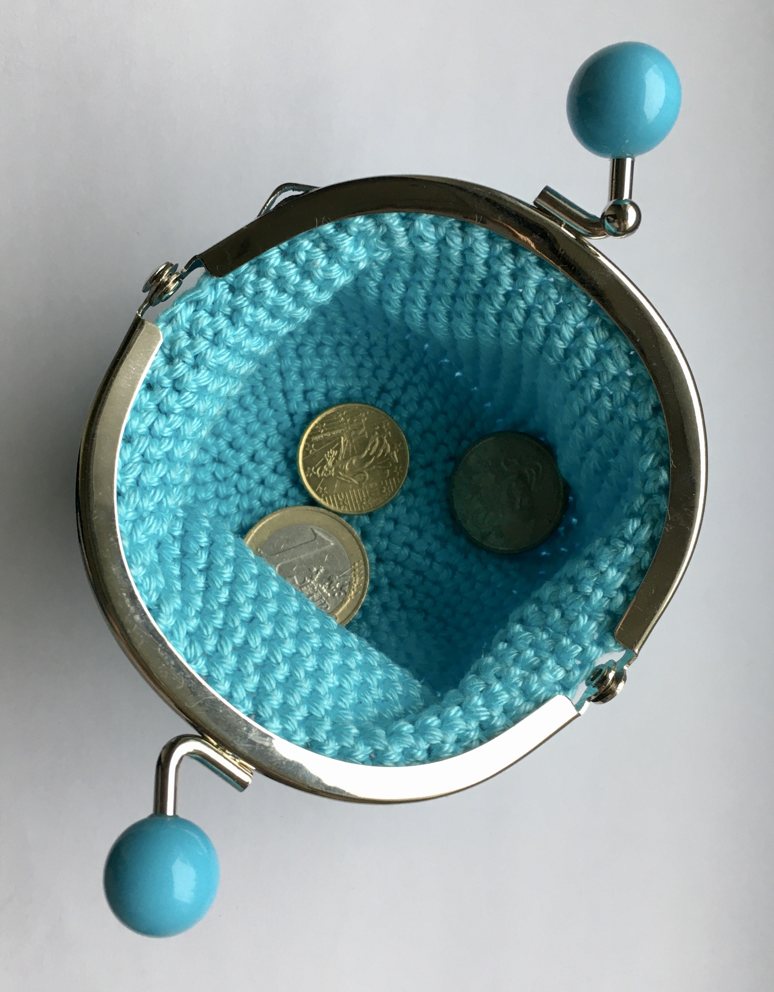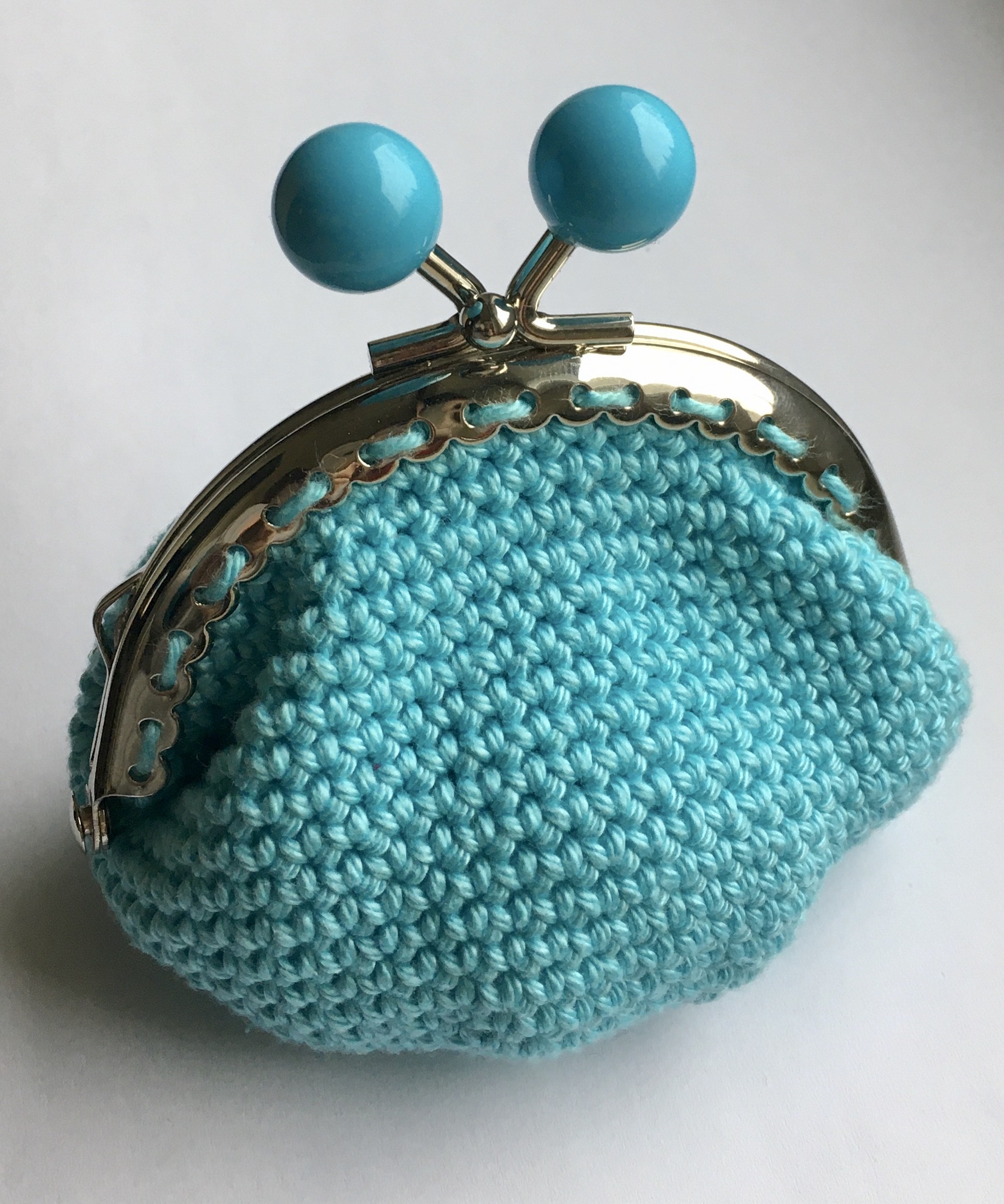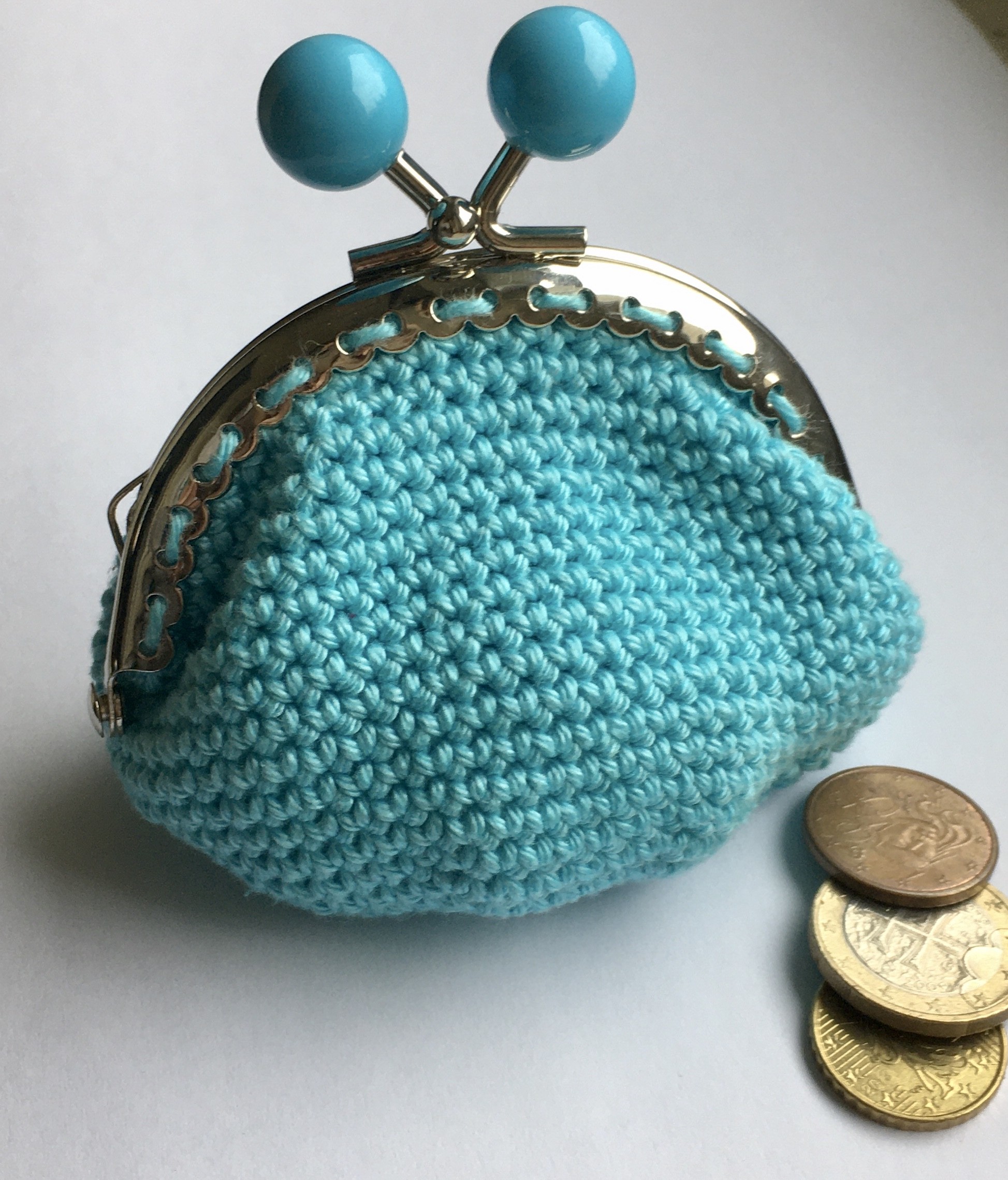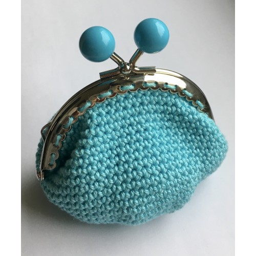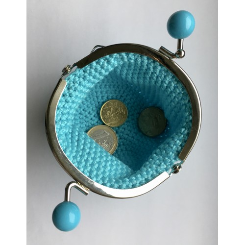 Ce porte-monnaie a été réalisé au crochet par mes soins, avec un fil 100 % coton bleu turquoise et un fermoir à boules turquoises