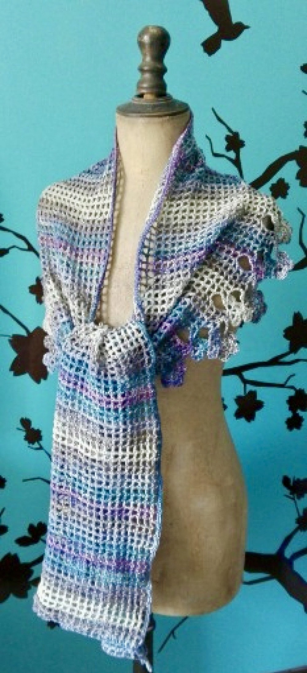 Elle est réalisée avec un fil 100 % coton dégradé allant du gris clair au violet en passant par du bleu