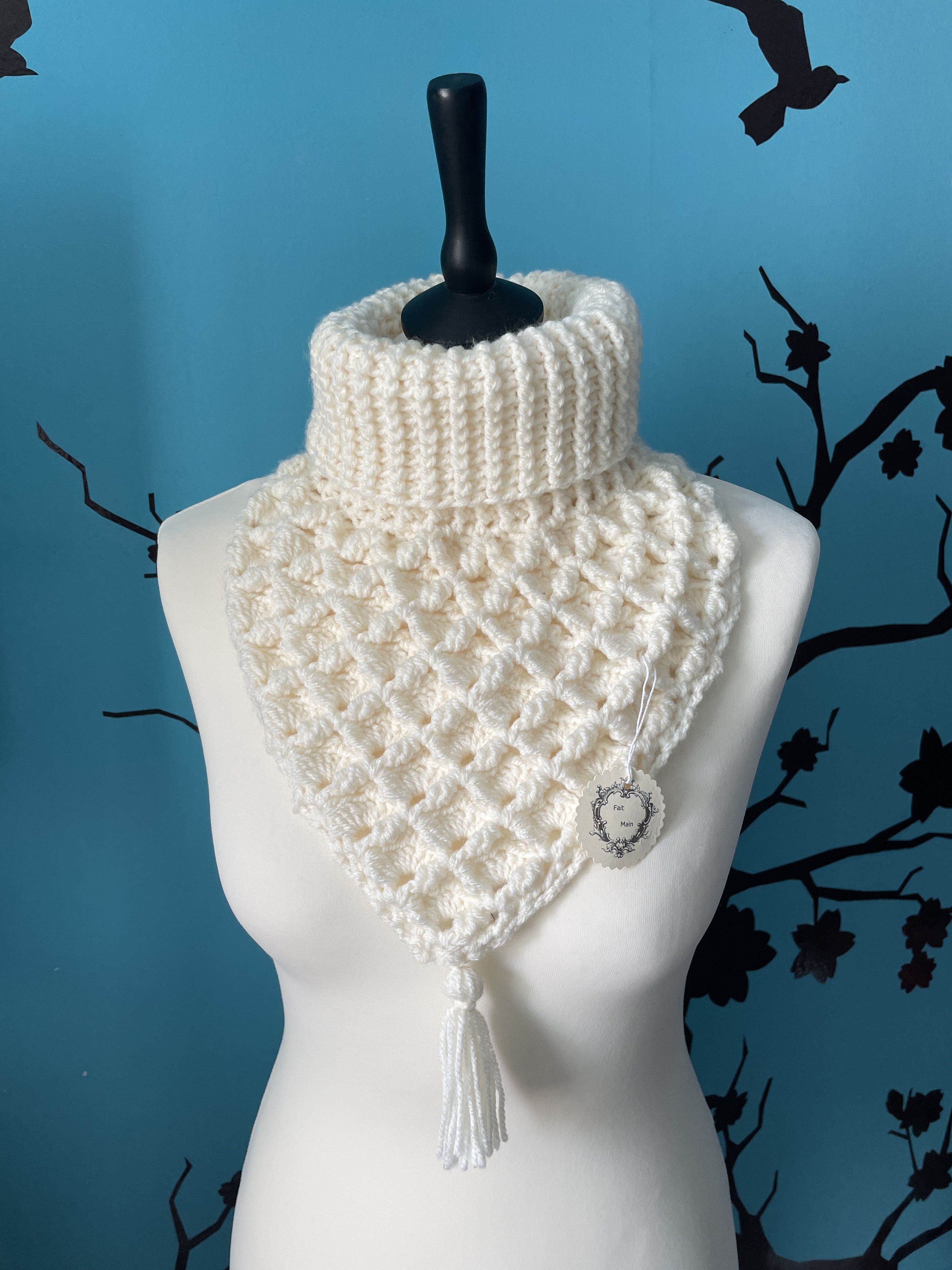 Col plastron blanc cassé au crochet – Tour de cou chaud fait main hiver
