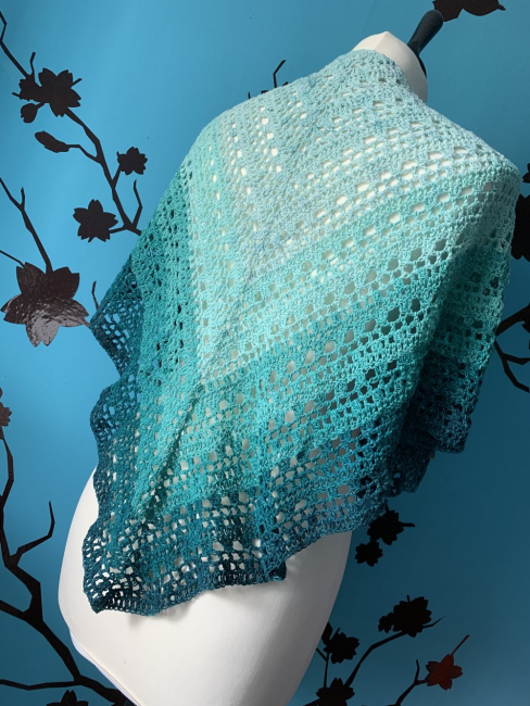 grand châle bleu réalisé au crochet